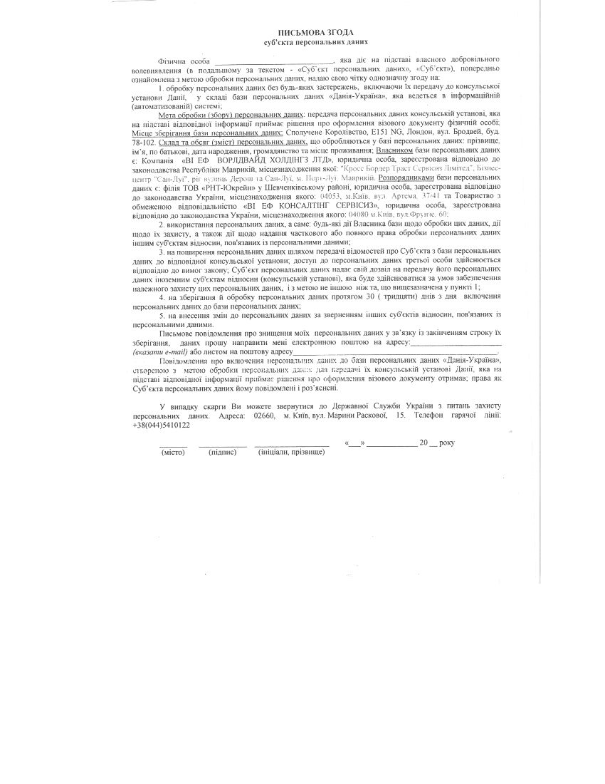 Документы для открытия визы в Данию: 1. Заполненная анкета на получение визы, заполняеться нашим визовым менеджером на основе опросника. 2. 2-а фото на паспорт, размер 3,5 на 4,5 см., не старше 3 месяцев (обязательно новое) 3. Паспорт, действительный еще в течение 3 месяцев после отъезда с территории стран Шенгенского соглашения и предыдущие паспорта. Копии паспортов и страниц с предыдущими визами и штампами. 4. Внутренний паспорт (оригинал должен быть предъявлен при подаче ) и фотокопия внутреннего паспорта; 5. Доказательство наличия медицинской страховки. Медицинская страховка должна покрывать любые расходы, которые могут возникнуть в связи с репатриацией по медицинским причинам, срочного медицинского вмешательства и лечения в медицинском учреждении во время пребывания на территории стран Шенгенского соглашения. Страховой полис должен действовать на территории всех стран Шенгенского соглашения в течение всего срока пребывания, а сумма страховой выплаты должна быть не менее 30.000 евро. Паспорт с действительной визой будет выдано заявителю, только после того, как оригинал медицинской страховки будет показано в Посольстве. 6. Доказательство наличия средства передвижения (обратный билет или бронирование автобуса) должен предоставляться только по получении визы. Если вы путешествуете авто: копия грин - кард и водительских прав. 7. В случае, если заявитель не является гражданином, а только проживает на территории Украины, действующий вид на жительство - и / или работу и его перевод на английский язык. 8. Если Вы не еще не достигли 18 лет, Вам нужно предоставить заверенный нотариусом доказательство родительского согласия на Вашу поездку, его перевод на английский язык, а также свидетельство о рождении. 9. Оригинал письменного запроса от украинского туристического агентства с перечнем всех туристов определенной группы с указанием имени, фамилии, даты рождения, пола, продолжительности и количества поездок, даты первого заезда и программы путешествия (маршрут, гостиницы, информация по транспорту и по водителей). 10. Возможно семейное или иное родства между туристами одной группы (например коллеги, семья, супруги, друзья) нужно обязательно указать и предоставить комментарии в письменном запросе от туристического агентства. 11. Подтверждение того, что было заключено соглашение с датским аккредитованным туристическим бюро на эту поездку. Предоставляется туристической компанией. 12. Доказательство подписки поездки как пакетного тура - как минимум транспорт и маршрут. Скандинавский партнер должен прислать подтверждение бронирования гостиницы и других подписки в Дании прямо к украинской туристической компании. Туристическая компания должна принести подтверждение вместе с визовыми анкетами и дополнительными документами в Посольство. 13. Доказательство трудоустройству Если Вы работаете: Справка с места работы с указанием должностных обязанностей, даты принятия на работу, а также продолжительности отпуска (подтверждение того, что заявитель сможет вернуться к работе); Если Вы частный предприниматель: Документы, подтверждающие наличие частного бизнеса , свидетельство о регистрации компании в Украине, подтверждение уплаты налогов за последние 2-а квартала; Если Вы учитесь: Подтверждение от образовательного учреждения, что заявитель сможет