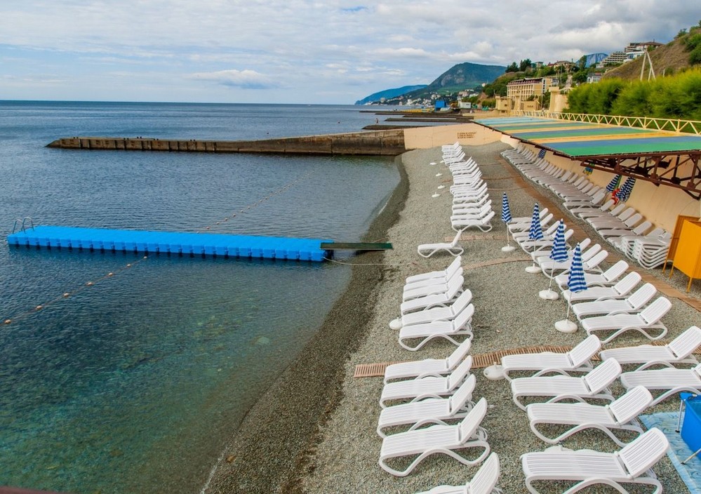на берегу Чёрного моря, на закрытой и охраняемой территории 2,5 га парковой зоны на базе современного комплекса КК "Golden (Голден)" 3* г. Алушта.